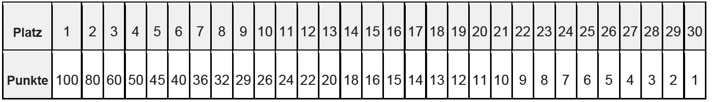 Für mich heisst das konkret ich muss Ende der Saison unter die Top 30 des Slalom-Weltcups sein. Stand heute – beim Schreiben dieses Newsletters – braucht man dafür 60 Weltcuppunkte. Es steht nur noch ein WC -Slalom an. Hier das Punktesystem (als Orientierung, welche Range erforderlich ist):